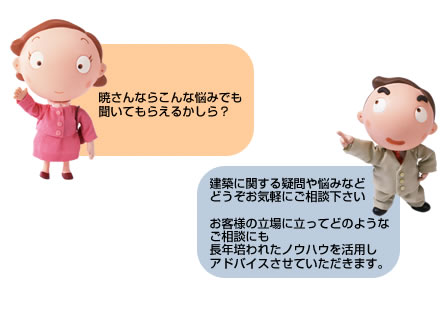 土地の活用や建物の新築・増改築に関するお悩みなどがございましたら、どんな小さな疑問でも気軽にご相談下さい。敷地に関する、法規制限資金面などあらゆる条件を考慮した上で様々な可能性を追求し、アドバイスさせていただきます。